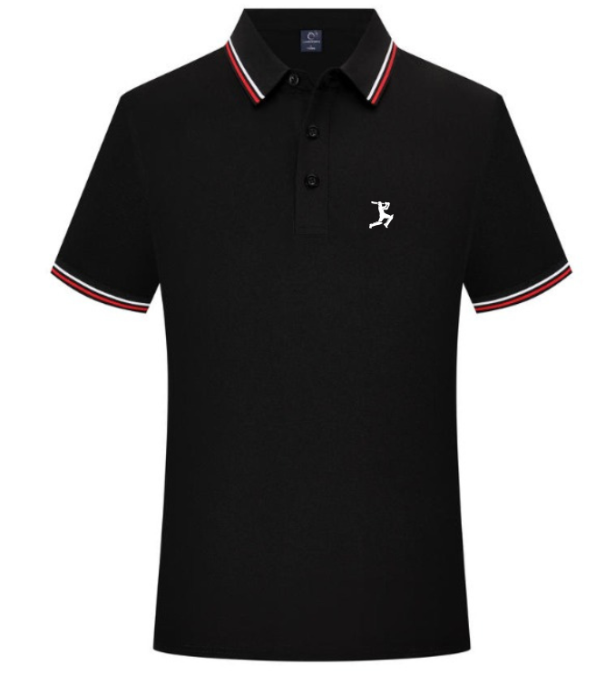 Luxury black cotton polo shirt with contrast tipped trim. Sophisticated men’s polo featuring exclusive embroidered branding and premium piqué fabric construction.